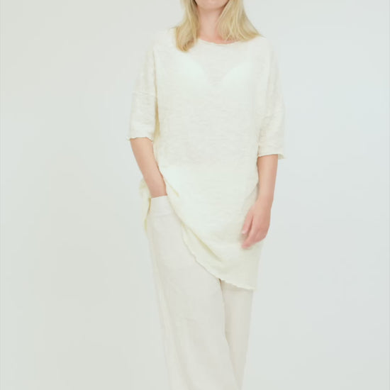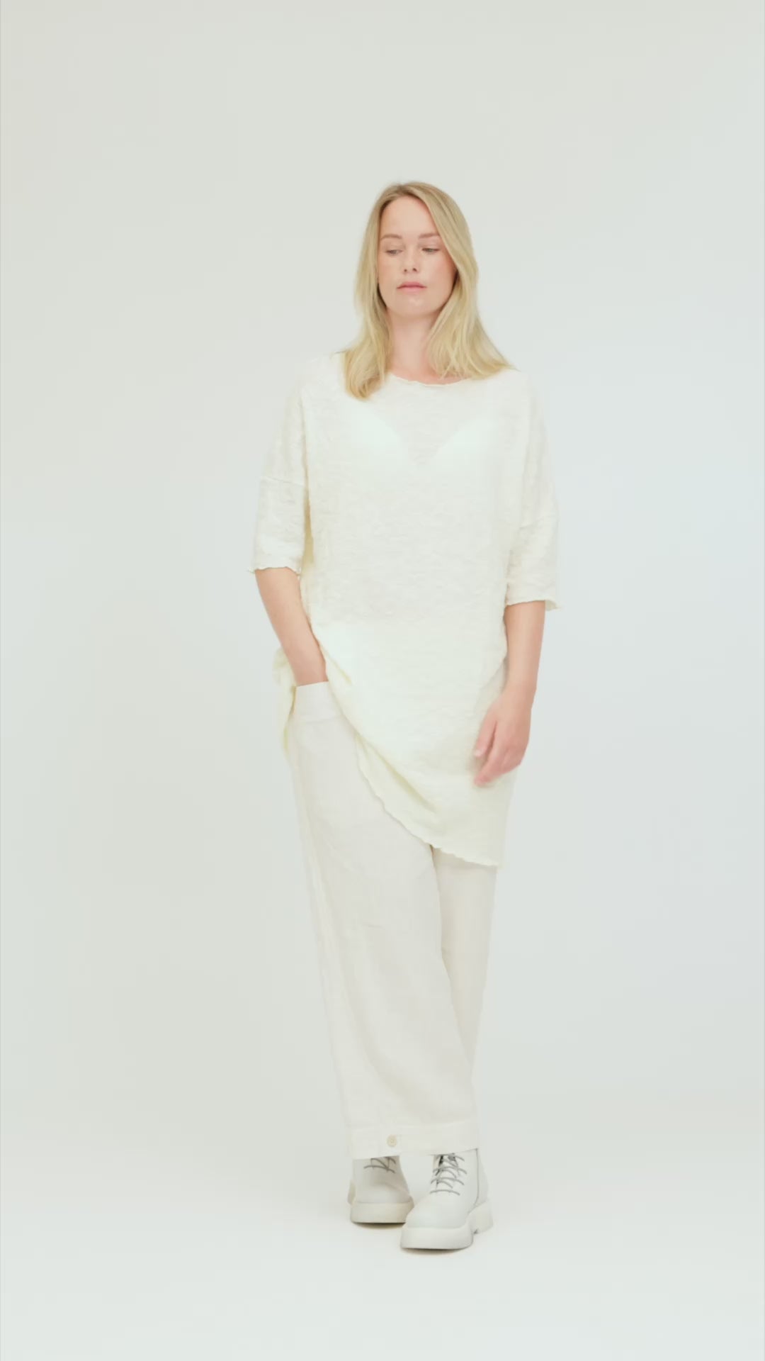 Knälång klänning i tunn jacquardstickad merinoull med fin struktur. En enkel och bekväm klänning med många användningsområden och som passar alla säsonger.