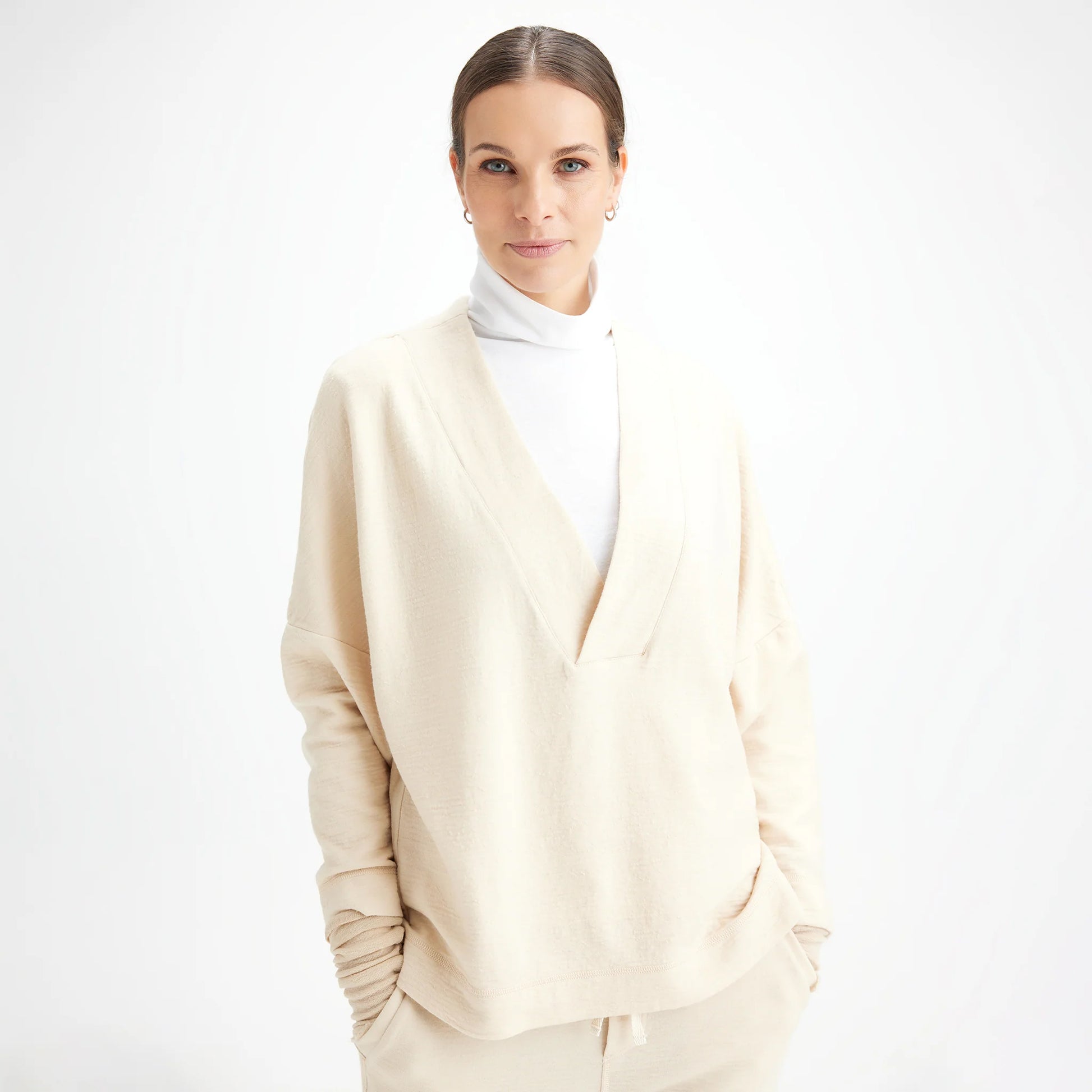 Passform: Lös och ledig passform. Tröjan har en oversize passform med nedhasad axel. Modellen i blå tröja bär storlek XS, modellen i benvit tröja bär storlek M,